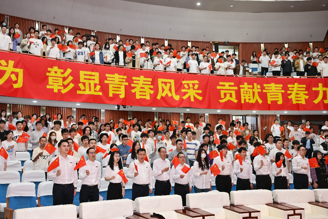 最后,全场师生挥舞手中的国旗,合唱《歌唱祖国》,表彰大会在激昂的歌声中落下帷幕。接下来,物信青年师生将继续传承发扬五四精神,践行福大“三种精神”,全面落实学校“11个一流”建设要求,推动学院高质量发展再上新台阶。
