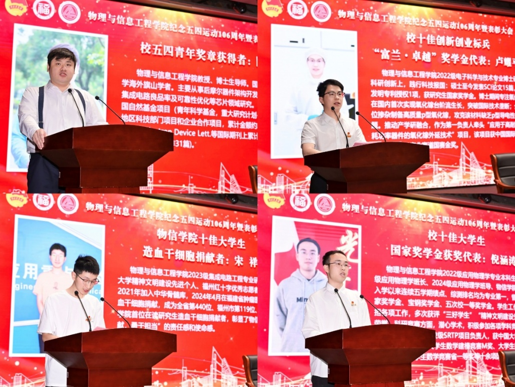 会上,学院四名优秀青年师生代表依次上台发言,他们结合自己的工作学习,分享了在科研攻关、学术学业、创新创业、志愿服务等方面的先进事迹和心得体会,激励物信学子共同传承五四精神,携手书写奋斗青春的新篇章。