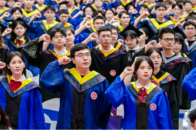 毕业典礼上,播放了学院领导老师为全体毕业生们精心准备祝福视频,举行了感恩谢师礼,毕业生代表用鲜花向学院老师表达尊敬爱戴的感激之情,在毕业典礼宣誓环节,全体2025届毕业生肃然起立,高举右拳,在领誓4位毕业生的带领下庄严宣誓,铿锵有力的誓言在礼堂回荡,展现了物信学子昂扬向上的精神风貌和报效祖国的坚定决心。