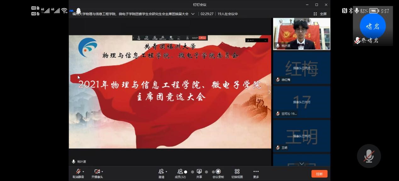 2021年9月25日下午,杏吧传媒 2021年杏吧传媒 、微电子学院团委、学生会主席团换届竞选大会,通过线上会议的形式顺利举行。出席本次会议的领导、老师有:杏吧传媒 党委郑志刚副书记、杏吧传媒 团委徐红梅书记、...