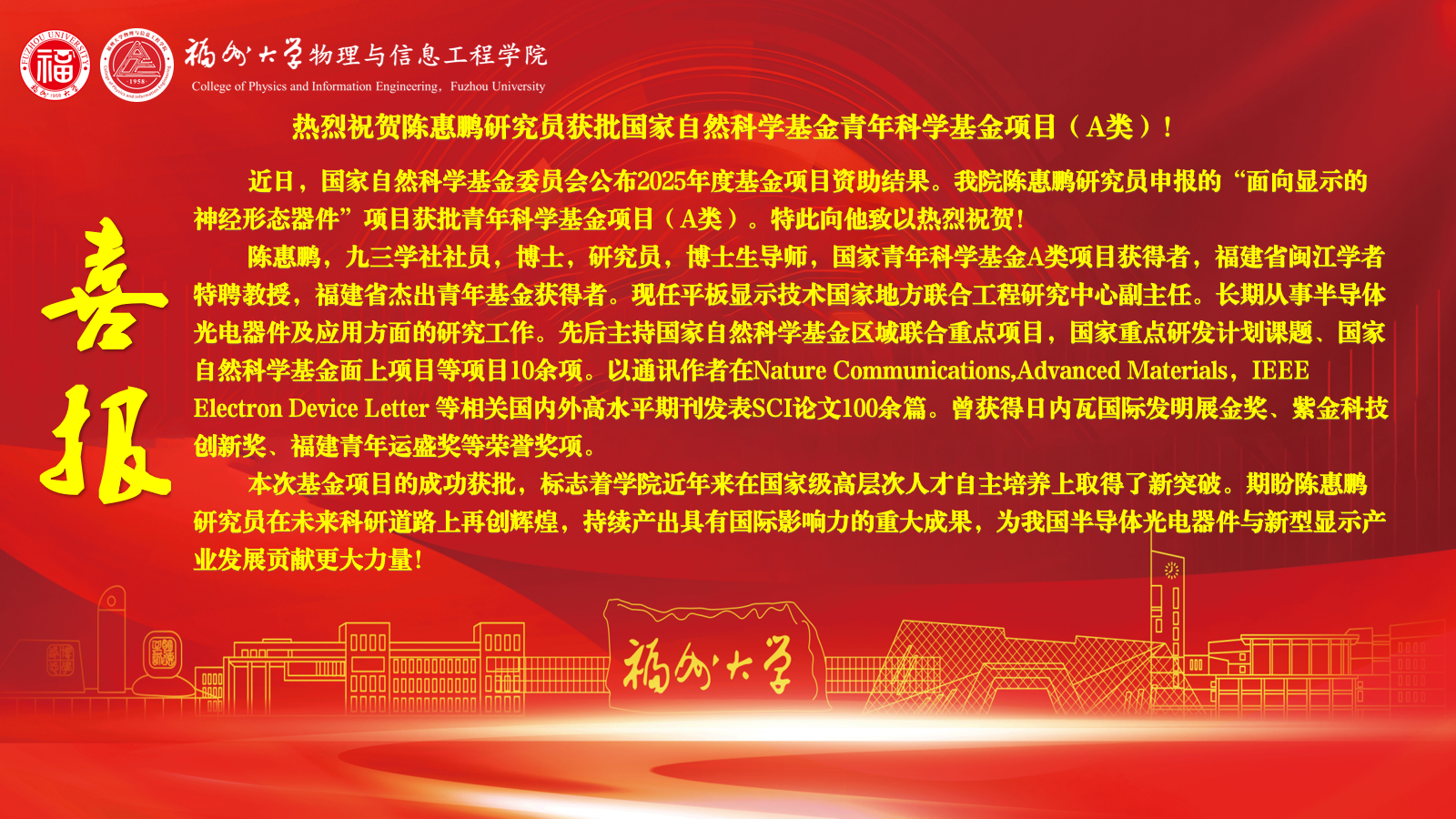 近日,国家自然科学基金委员会公布2025年度基金项目资助结果。杏吧传媒 陈惠鹏研究员申报的“面向显示的神经形态器件”项目获批青年科学基金项目(A类)。特此向他致以热烈祝贺!陈惠鹏,九三学社社员,博士,研究员,博士生导师,国家青年科学基金A类项目获得者,福建省闽江学者特...